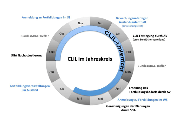 Es hat sich bewährt, dass einzelne Fachgruppen und/oder Tandems aus Content/Subject- und Language-Teachers (frei nach dem Motto „You´ll never walk alone!“) zuerst für CLIL geeignete Inhalte/Themen/Abschnitte in den Lehrplänen der jeweiligen Unterrichtsgegenstände identifizieren.